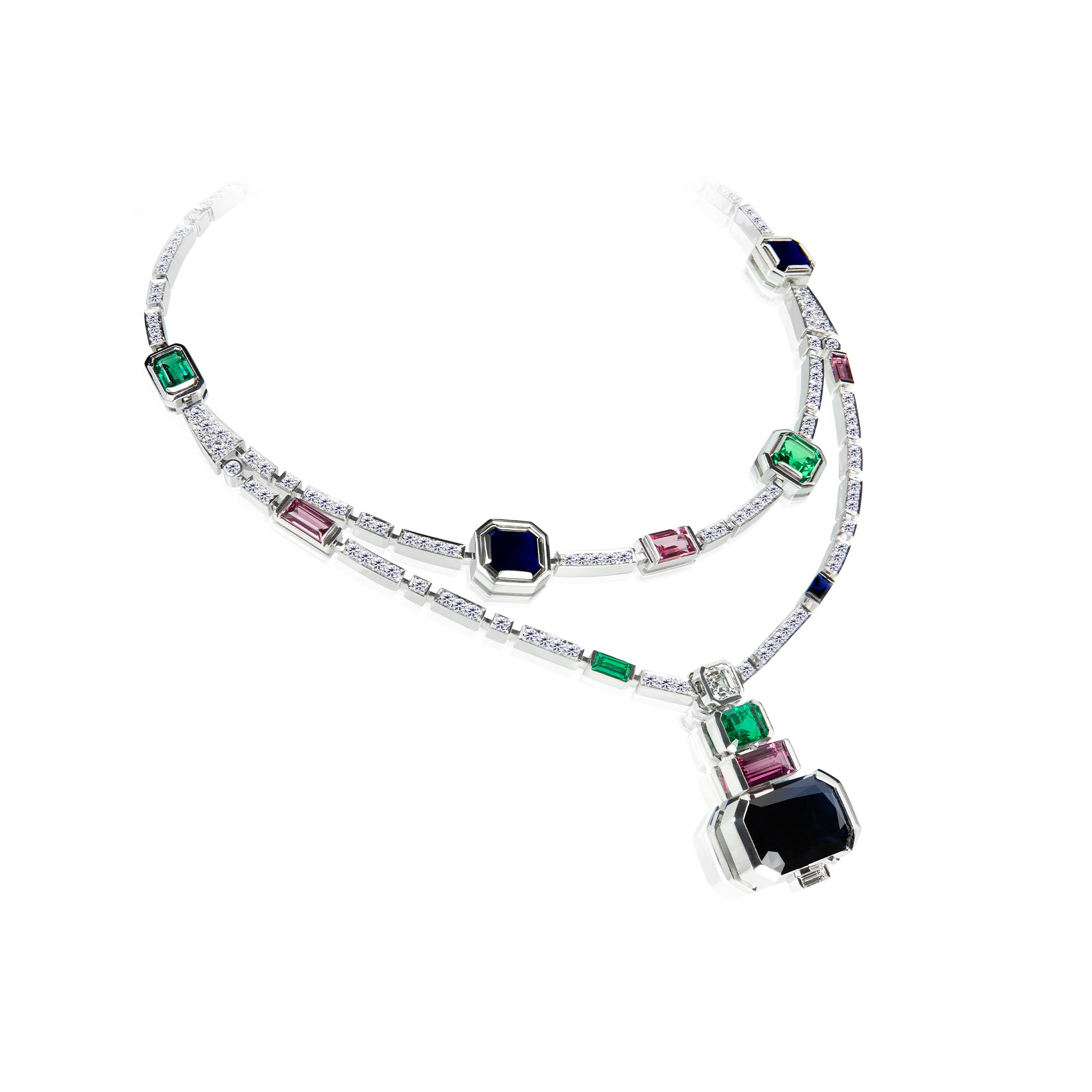 The Regina Royale Double Strand Necklace, exquisitely crafted with a signature arrangement of multi-varied geometric segments. This High Jewel necklace showcases an exceptional selection of natural diamonds, Australian midnight blue sapphires, Zambian emeralds and pink tourmalines. A bold yet refined statement necklace, the Regina Royale embodies contemporary luxury, precision craftsmanship, and timeless elegance.