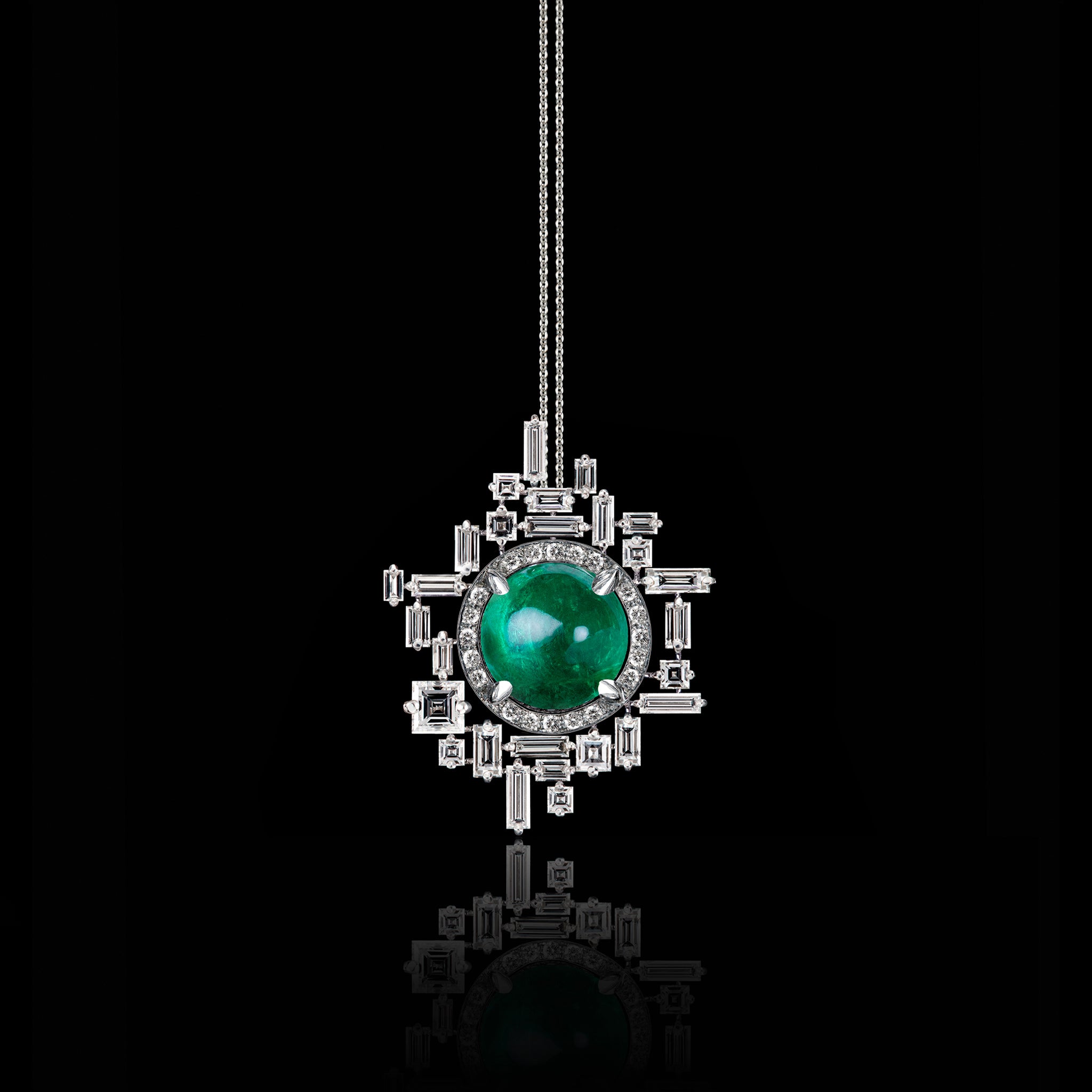 A bold interpretation of artistic form and refined design, drawing inspiration from the fragmented elegance of the Cubist movement. Visionary jeweller Stefano Canturi translates this avant-garde aesthetic into a contemporary jewel of striking presence and poetic geometry. At its centre, a cabochon cut Zambian emerald radiates a rich green hue, captivating, vibrant, and full of depth. Surrounding the emerald, a meticulously arranged constellation of baguette, carré, and round brilliant cut diamonds creates a rhythmic interplay of light and shape. The result is a harmonious balance of structure and brilliance, designed for those who wear their individuality with intention and grace.